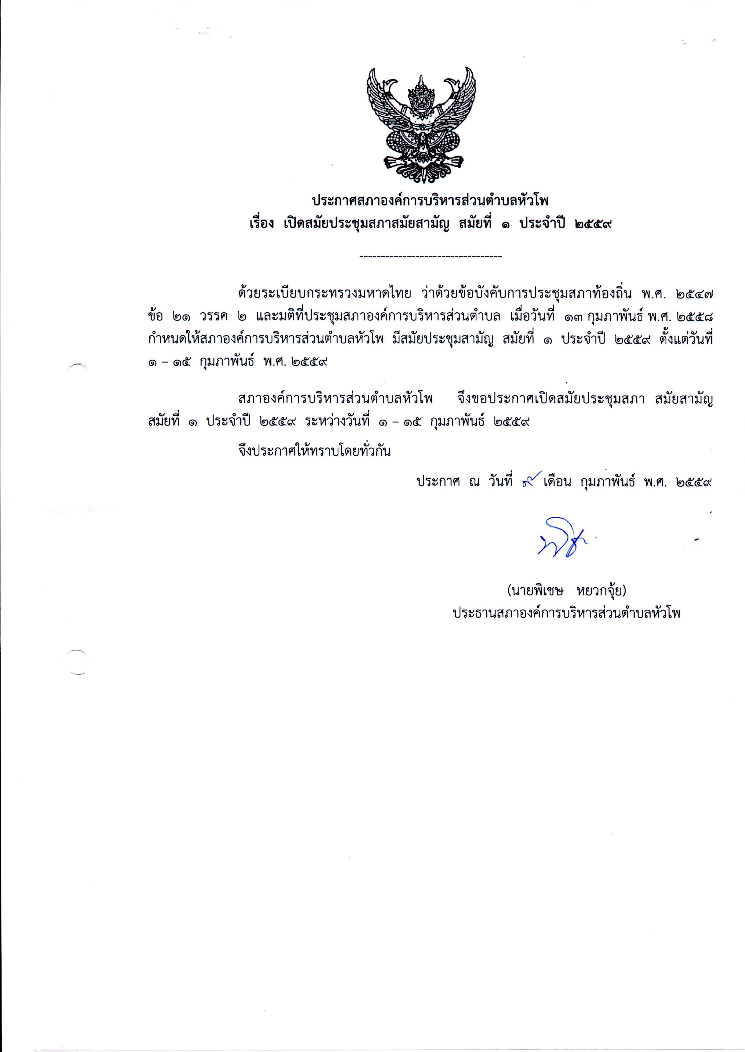 เรื่อง เรียกประชุมสภาองค์การบริหารส่วนตำบลหัวโพ สมัยสมัญ สมัยที่ 1 ประจำปี 2559
