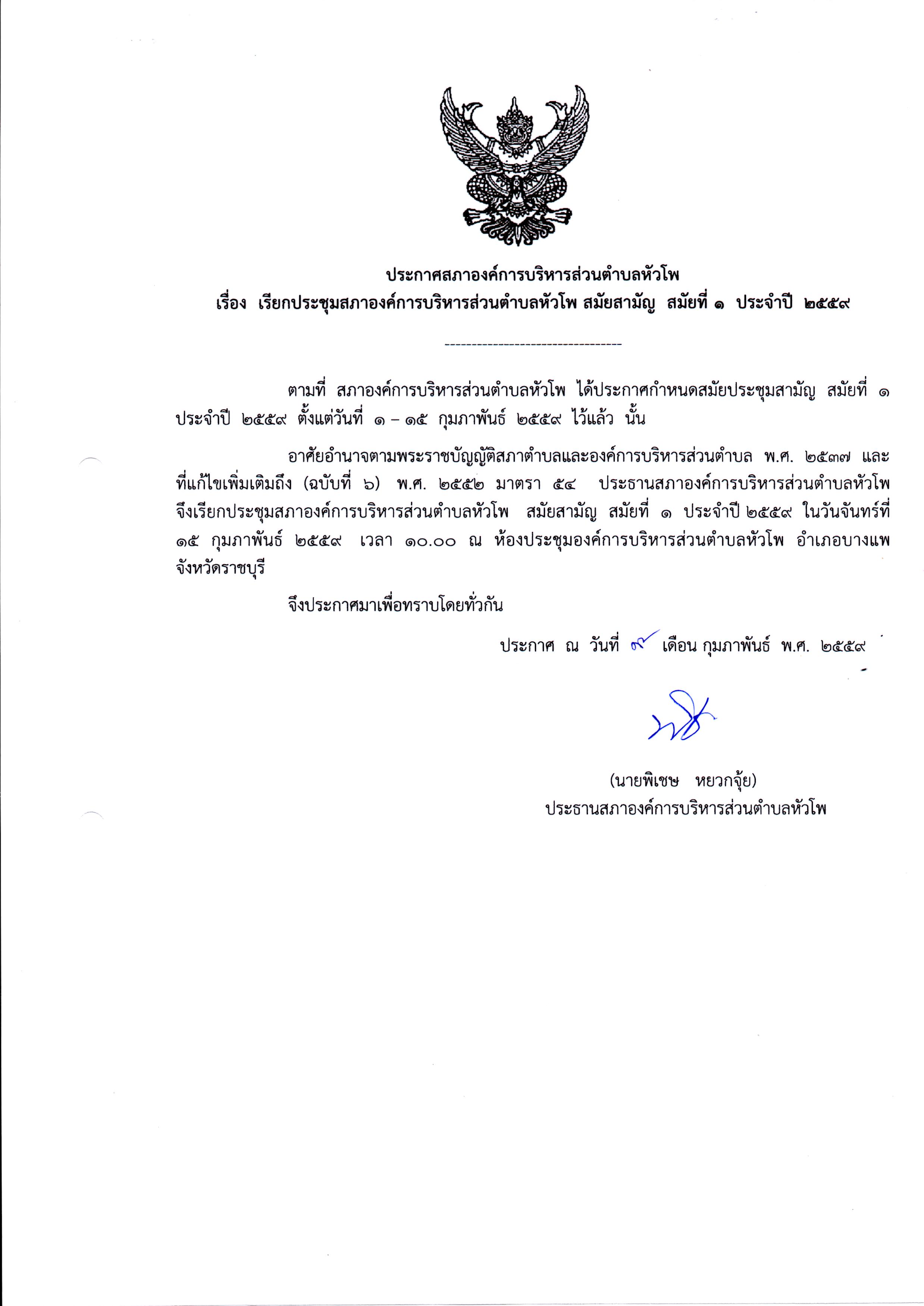 เรื่อง เรียกประชุมสภาองค์การบริหารส่วนตำบลหัวโพ สมัยสมัญ สมัยที่ 1 ประจำปี 2559